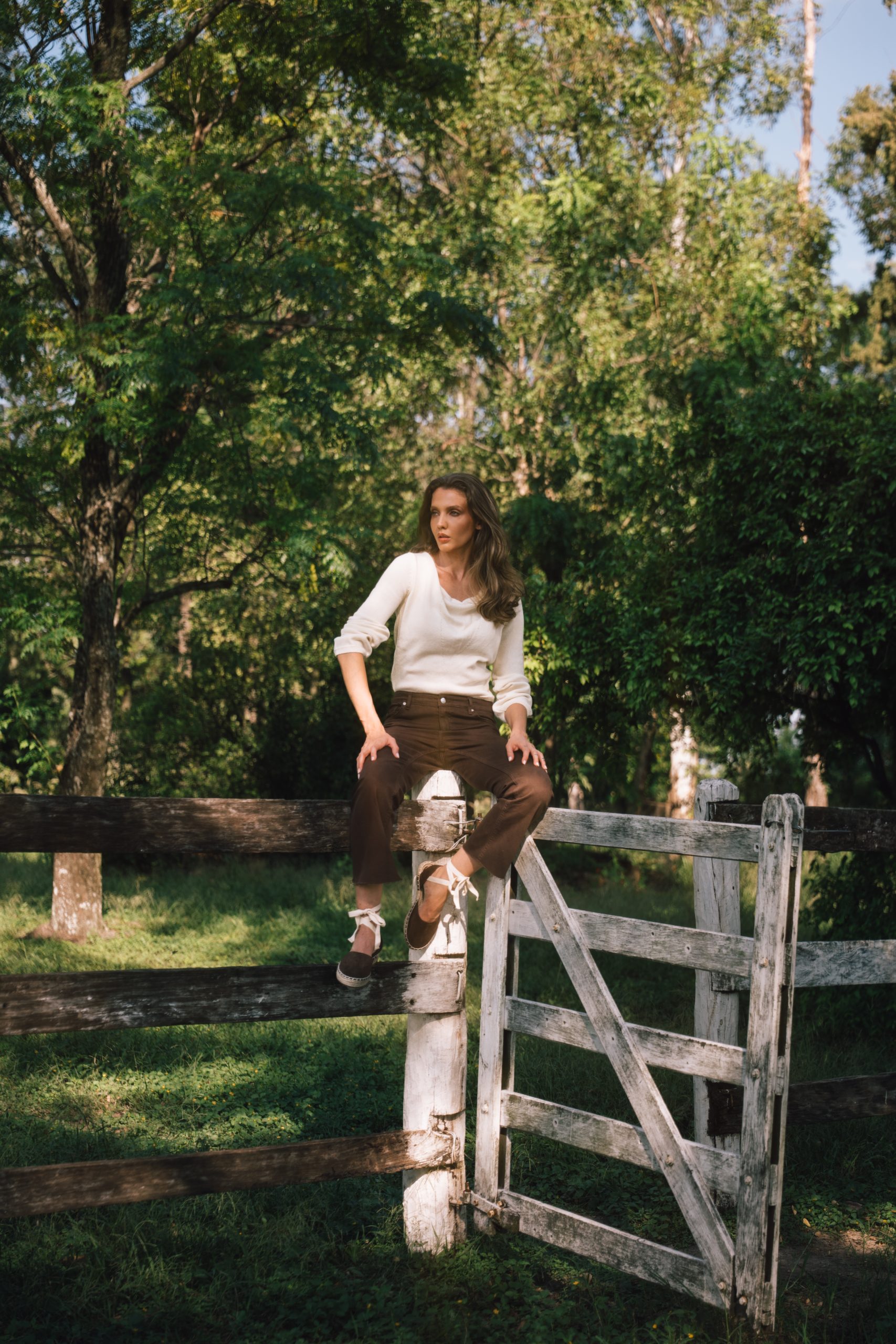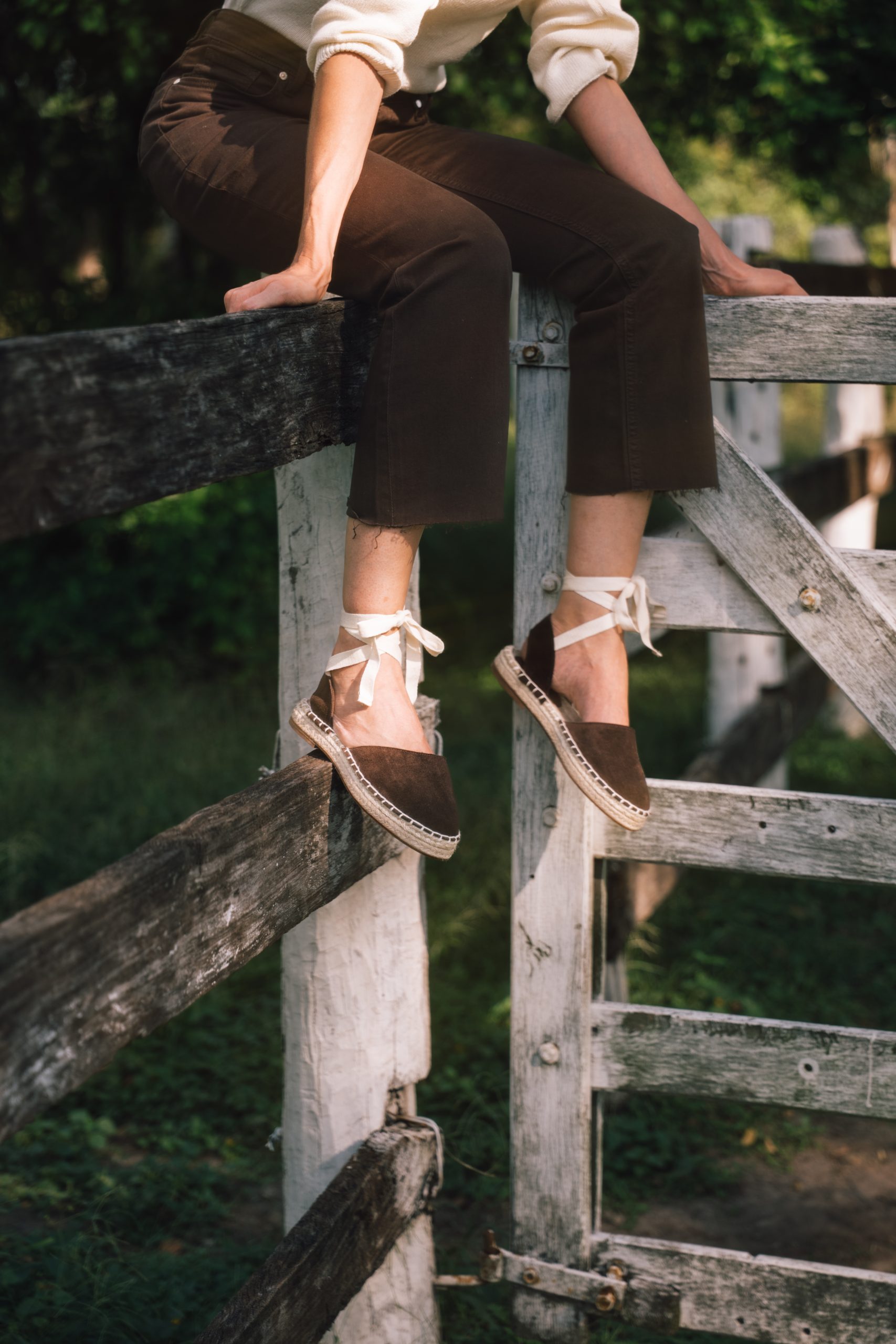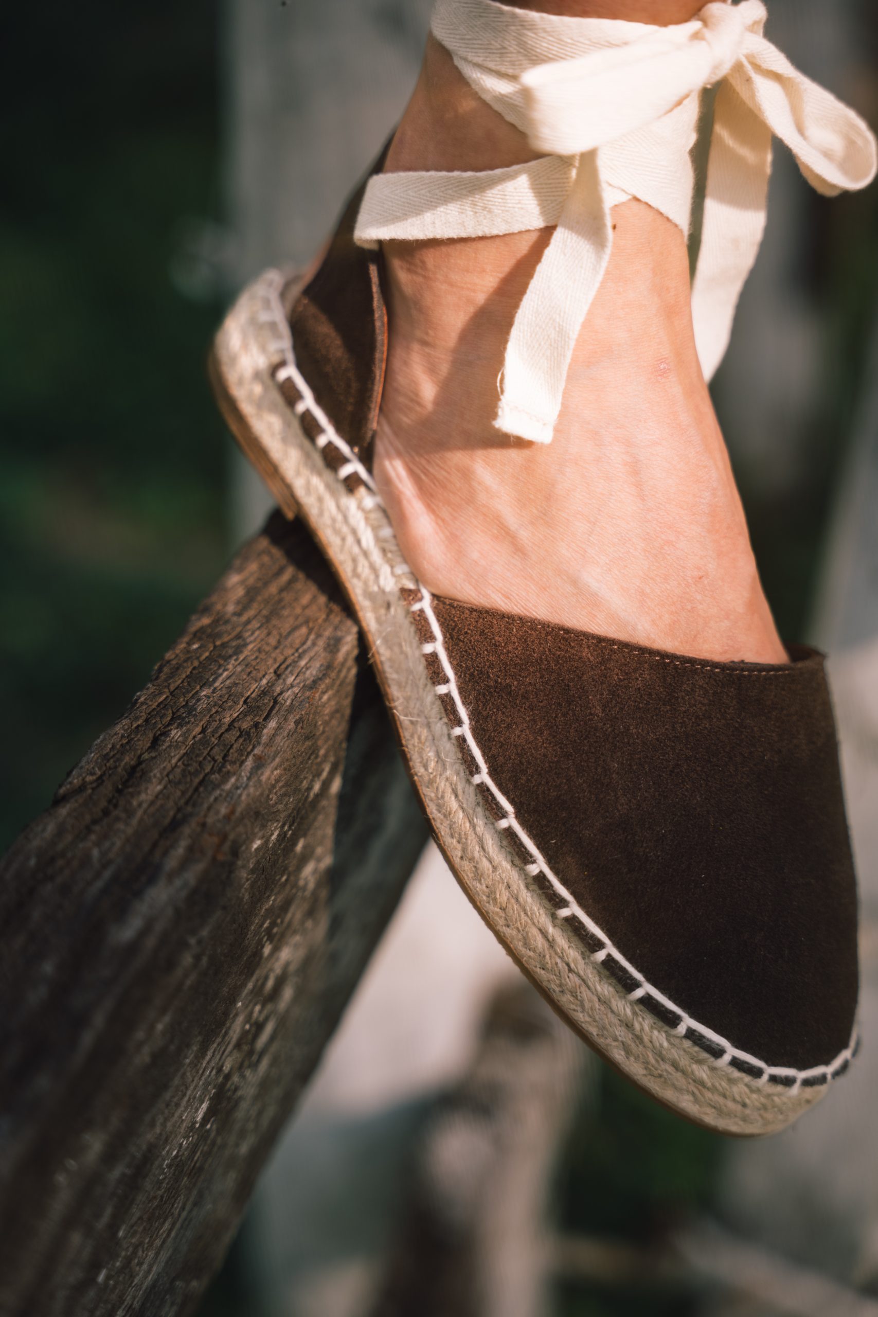 Alpargata baja, fresca y versátil. Base de yute natural de 2 cm y costura artesanal. Cintas al tobillo que se adaptan con suavidad al movimiento. En tono chocolat, aporta calidez y carácter a una silueta atemporal.